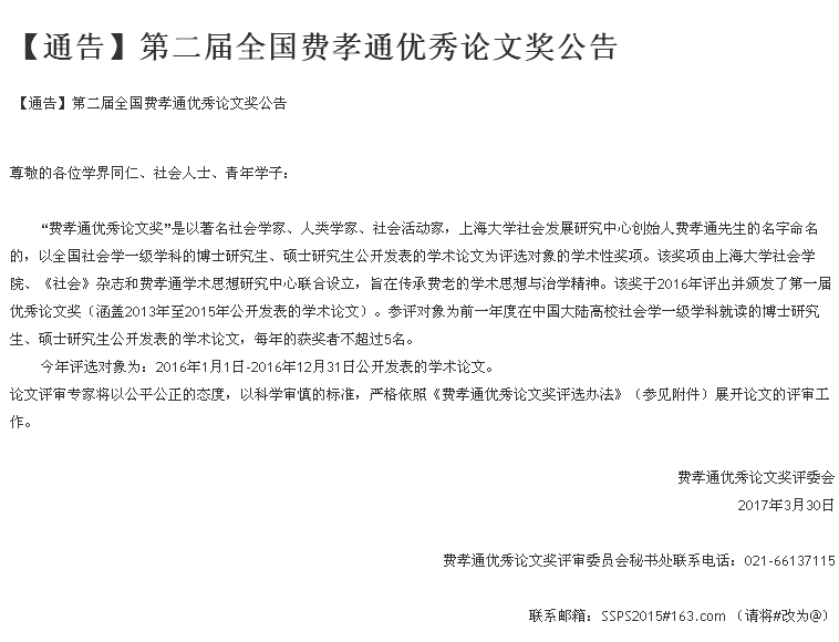 尊敬的各位学界同仁、社会人士、青年学子:------- ----------"费孝通优秀论文奖"是以著名社会学家、人类学家、社会活动家,ok138cn太阳集团社会发展研究中心创始人费孝通先生的名字命名的,以全国社会学一级学科的博士研究生、硕士研究生公开发表的学术论文为评选对象的学术性奖项。该奖项由ok138cn太阳集团古天乐、《社会》杂志和费孝通学术思想研究中心联合设立,旨在传承费老的学术思想与治学精神。该奖于2016年评出并颁发了第一届优秀论文奖(涵盖2013年至2015年公开发表的学术论文)。参评对象为前一年度在中国大陆高校社会学一级学科就读的博士研究生、硕士研究生公开发表的学术论文,每年的获奖者不超过5名。 -----------今年评选对象为:2016年1月1日-2016年12月31日公开发表的学术论文。 -----------论文评审专家将以公平公正的态度,以科学审慎的标准,严格依照《费孝通优秀论文奖评选办法》(参见附件)展开论文的评审工作。 ------------费孝通优秀论文奖评委会 ------------2017年3月30日 ------------费孝通优秀论文奖评审委员会秘书处联系电话:021-66137115 ------------联系邮箱:SSPS2015#163.com (请将#改为@) ------------ 【推荐表下载】请点击: 费孝通论文奖推荐表20160301:http:/Portals/529/%e8%b4%b9%e5%ad%9d%e9%80%9a%e8%ae%ba%e6%96%87%e5%a5%96%e6%8e%a8%e8%8d%90%e8%a1%a820160301.doc 【费孝通优秀论文奖评选办法】:http:/Default.aspx?tabid=22084&ctl=Detail&mid=64935&Id=194488&SkinSrc=[L]Skins/shxy_2fen/shxy_2fen