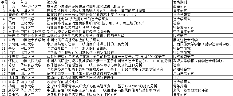 截至2016年6月10日,我们收齐了今年的论文评审申请,经筛选共有22篇(每个单位不得超过3篇,发表时间必须为2013年至2015年,第一作者需为在校研究生等要求)。