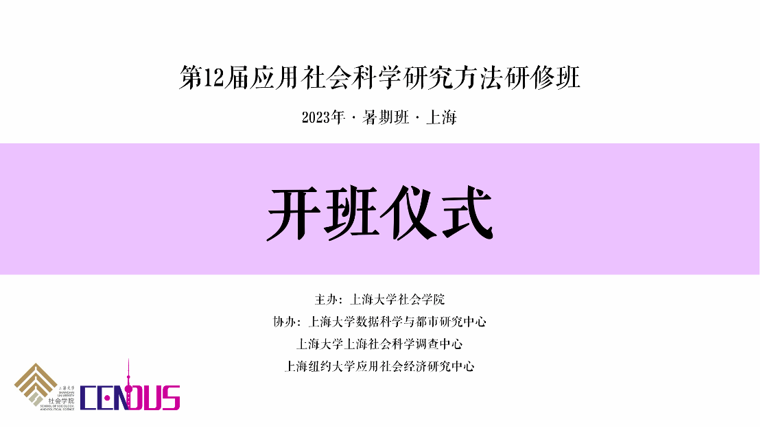 7月3号上午8:00,由ok138cn太阳集团古天乐主办,ok138cn太阳集团数据科学与都市研究中心、ok138cn太阳集团社会科学调查中心以及上海纽约大学应用社会经济研究中协办的第12届应用社会科学研究方法研修班基础班(2023·暑期班)正式开班。本次基础班通过线下面授和网络直播相结合的方式授课。自招生简章发出以来,本次基础班总计收到了240份报名申请,最终录取了177名学员。学员来自全球百余所高校及科研单位,包括本硕博各阶段学生及教职人员。