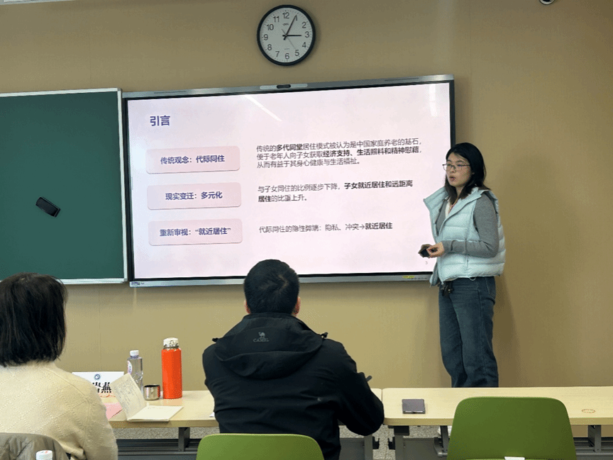 樊雯雯同学的汇报,主要围绕居住安排对老年人生活满意度的影响展开,并探讨亲代支持的调节作用。研究发现,与“就近居住”相比,“代际同住”或“代际远住”对老年人的生活满意度有显著的负面影响,但强度视老年人提供亲代支持与否和类型而定。