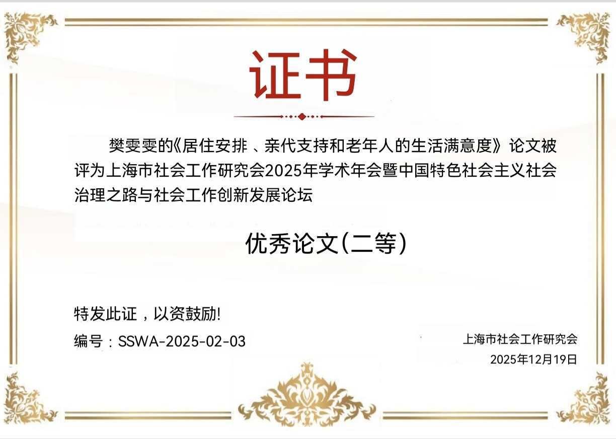 2025年12月19日,2023级社会学硕士研究生樊雯雯参加上海市社会工作研究会2025年学术年会,在“照护政策实践与创新”分论坛上作关于“居住安排、亲代支持和老年人的生活满意度”的汇报,获二等奖。