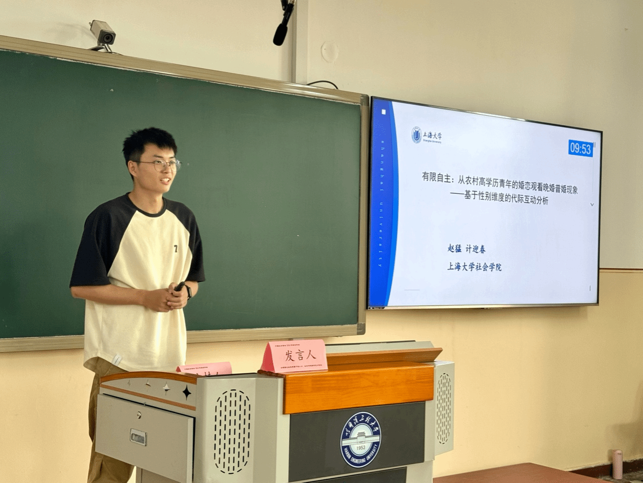 赵猛以《有限自主:从农村高学历青年的婚恋观看晚婚普婚现象——基于性别维度的代际互动分析》为题进行了汇报。研究针对当前我国面临的异于西方国家和东亚社会的晚婚普婚模式,从处于传统和现代之间的农村高学历青年的婚恋观进行解释。研究对16位农村高学历青年的深度访谈发现,男性对于未来家庭的想象更加积极,更为看重结婚所带来的经济责任,进而在将满足经济条件作为结婚的决定性因素;而女性普遍对未来家庭关系和分工具有负面想象,她们更加担忧婚姻破裂的风险,最终将找到合适条件的伴侣作为结婚时机。进一步研究发现,虽然个体的婚姻自主性在不断增强,但是在差异化的性别角色规范和代际关系下,男性更多通过实现自身立业和父母资助的方式成家,女性则更多迫于年龄规范和父母期待而考虑结婚。个体行动中呈现出有限自主性特征塑造出当前社会的晚婚普婚现实,这表明我国婚姻制度并未去制度化,而是呈现出恒常性。