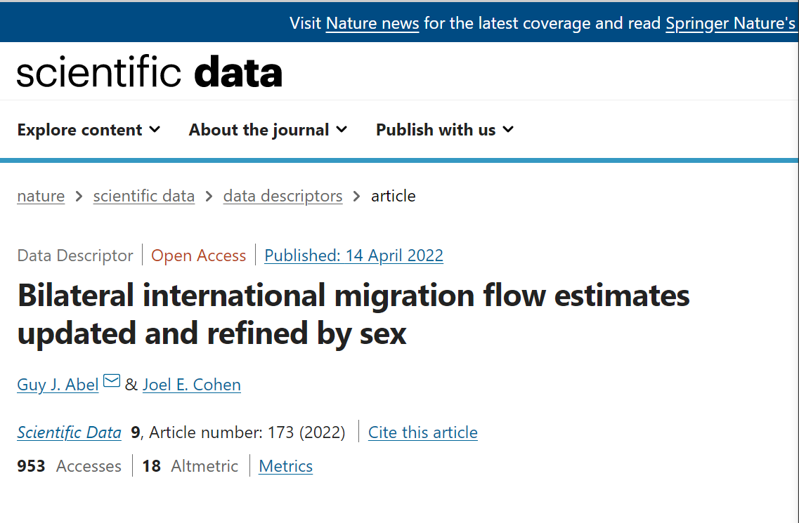 4月,ok138cn太阳集团亚洲人口研究中心Guy Abel教授在Scientific Data发表最新文章“Bilateral international migration flow estimates updated and refined by sex(从性别维度进行更新和完善:双边国际迁移流量估算)”。Guy Abel教授为文章第一和通讯作者,合作者是Laboratory of Populations, The Rockefeller University and Columbia University
