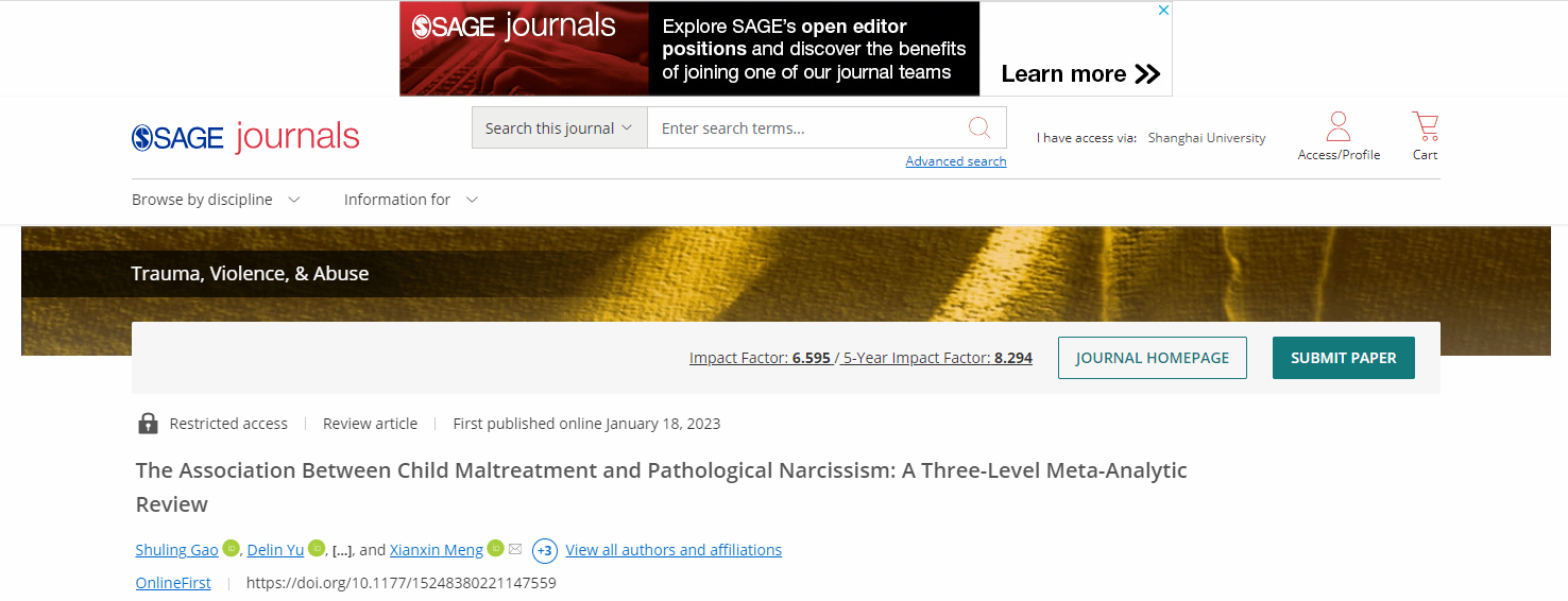 2023年1月18日,社会工作系高树玲博士为第一作者,在SSCI期刊《TRAUMA VIOLENCE & ABUSE》上在线发表最新研究成果“The Association Between Child Maltreatment and Pathological Narcissism: A Three-Level Meta-Analytic Review (儿童虐待与病理性自恋之间的关系:一项三水平元分析研究)”。
