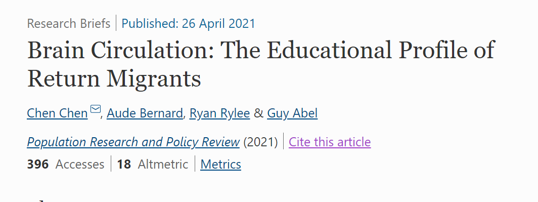亚洲人口研究中心陈晨博士近日在国际期刊Population Research and Policy Review上发表题为“Brain Circulation: The Educational Profile of Return Migrants(人才循环:回流移民的教育水平概况)”的文章。亚洲人口研究中心教授Guy Abel也是本文合作作者之一。