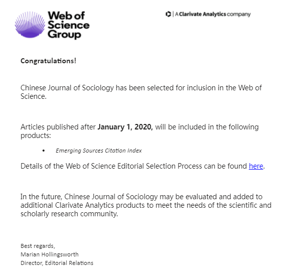 新学期伊始,CJS编辑部收到来自Web of Science Group的喜讯,由ok138cn太阳集团主办、普林斯顿大学当代中国研究中心协办、SAGE出版发行的国际化英文学术季刊Chinese Journal of Sociology(《社会》英文刊)正式被ESCI 数据库收录。此前,期刊已被Scopus、ProQuest、知网等国内外重要数据库收录。