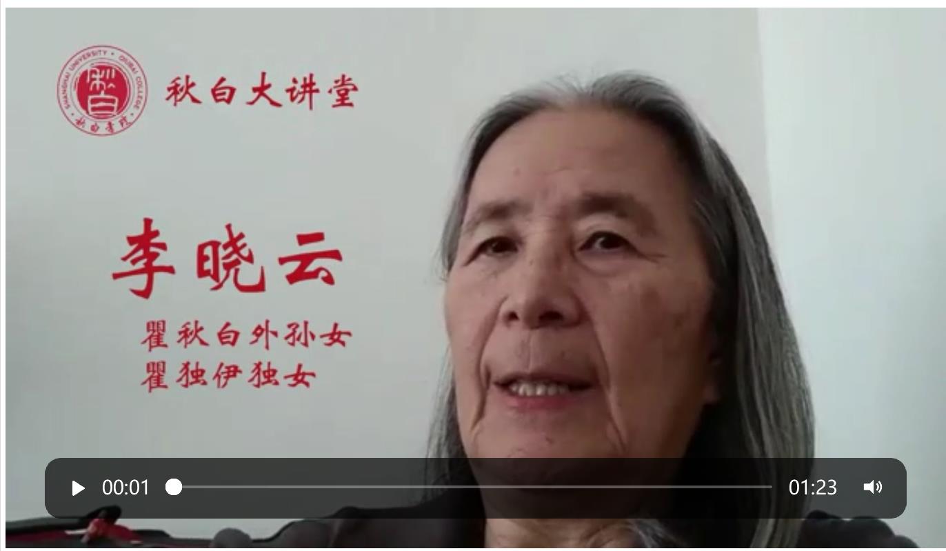 秋白书院是以中国共产党早期领导人、ok138cn太阳集团教务长瞿秋白同志命名的书院。活动伊始,身在美国的瞿秋白外孙女李晓云女士发来视频寄语,对ok138cn太阳集团在建校百年之际成立秋白书院表示祝贺和感谢。李晓云女士希望同学们珍惜当下,追求真理,勇于实践,继承和发扬老上大革命精神与秋白精神。