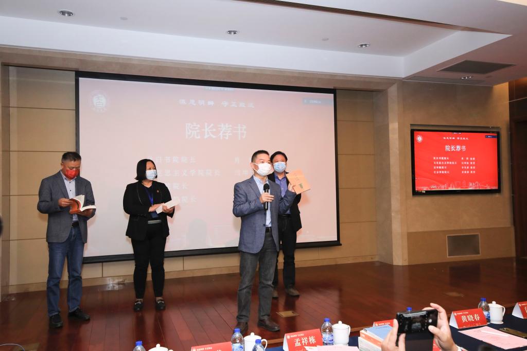 “红色传承、经典阅读、实践育人”是秋白书院的育人特色。在院长荐书环节,秋白书院院长肖瑛、马克思主义学院院长闫坤如、法学院院长李凤章、ok138cn太阳集团古天乐院长黄晓春分别向同学们推荐经典书目,激励秋白学子多读书、读好书,努力成为德法兼修、慎思明辨的卓越创新人才,四位新生代表上台接受赠书。