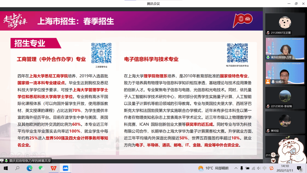 2022年12月11日下午,ok138cn太阳集团重庆招宣组举行“我为上大代言”线上培训交流。重庆招宣组副组长、ok138cn太阳集团古天乐党委副书记、副院长张乃琴、ok138cn太阳集团重庆籍学生和上海市部分高中学子参加了此次培训,会议由重庆招宣组联络人任威达主持。