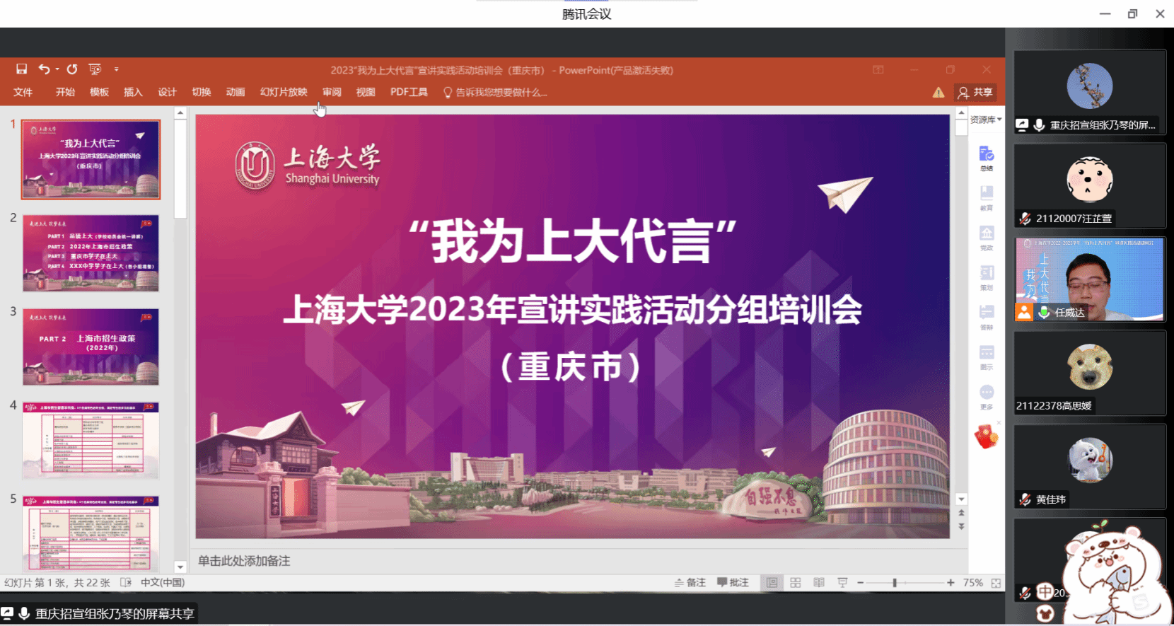 之后,张书记为同学们介绍了培训内容,从ok138cn太阳集团“红色学府”历史背景、“特色人才培养模式”、“2022上海市春季招生政策”与“上海市综合评价录取”、“2022重庆市招生情况”等重点问题进行分类介绍和讲解,从优质生源基地到毕业去向的综合具体情况展开,使大家更好理解我校在招生工作中具有的竞争实力与优越条件,也积极鼓励同学们在“协调组织”、“因地制宜”、“创新形式”等方面更好地宣传上大优秀文化,展示自己在上大的成长过程与收获成果。