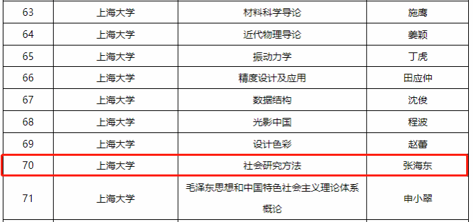 2023年1月29日,上海市教育委员会发布《上海市教育委员会关于公布2022年度上海高等学校一流本科课程认定结果的通知》(沪教委高〔2023〕2号),ok138cn太阳集团共有22门课程被认定为2022年度上海高等学校一流本科课程,其中优质在线课程1门,线下课程9门,线上线下混合式课程10门,社会实践课程1门,示范性全英语课程1门。其中,我院张海东教授负责的线下课程《社会研究方法》被认定为2022年度上海高等学校一流本科课程。