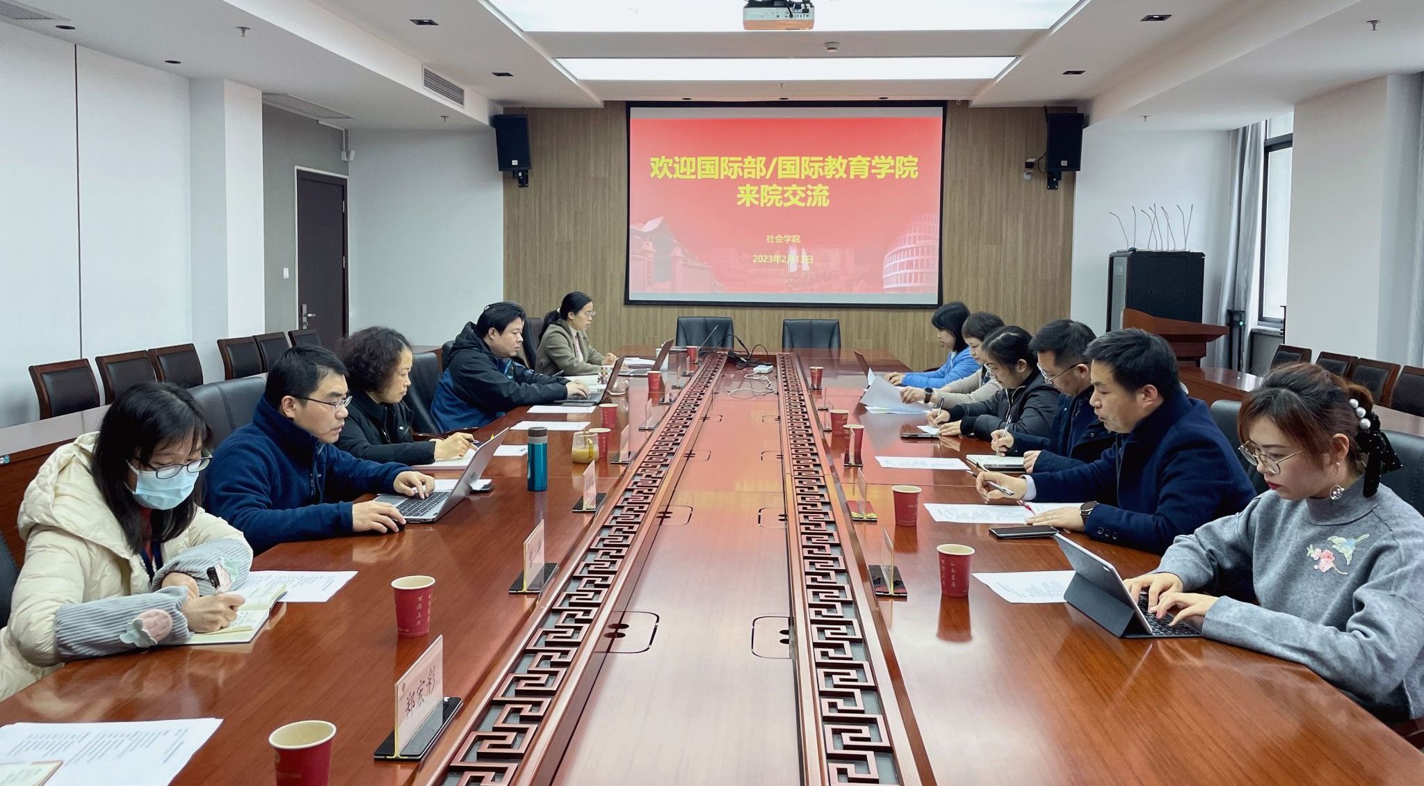 2月13日上午,ok138cn太阳集团国际部党委书记王丽娜、国际部副部长、国际教育学院院长李颖洁、国际部党委副书记、国际教育学院副院长陈秀猛、国际教育学院副院长裴雨来、国际教育学院国际学生招生办公室主任欧阳晓琴、国际教育学院研究生辅导员苗昱一行来我院交流。院领导杨锃、黄晓春、张乃琴、袁浩、盛智明、纪莺莺,外事秘书莫晓燕、研究生教学秘书曾艳和本科生教学秘书郑宏彩参会交流。
