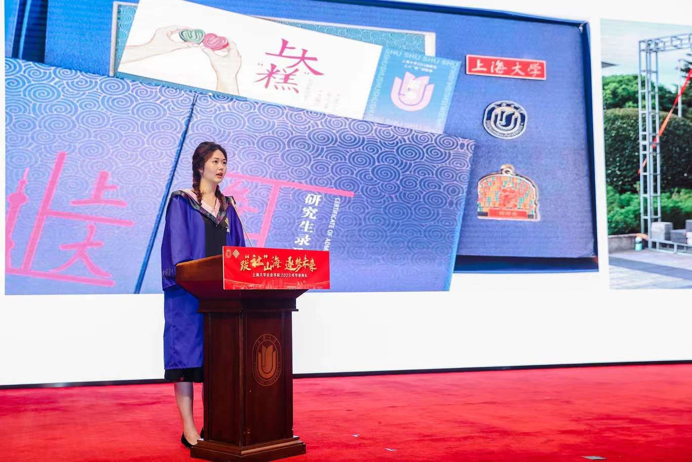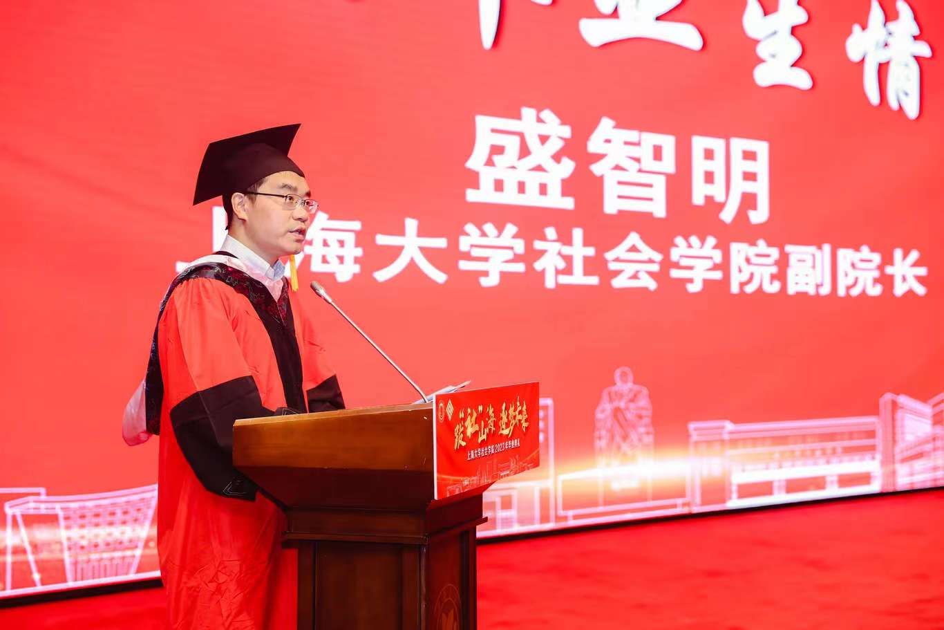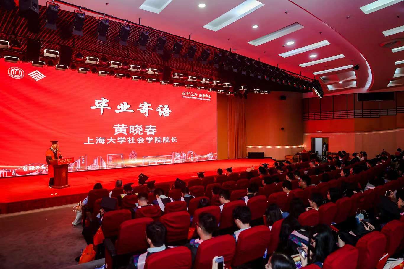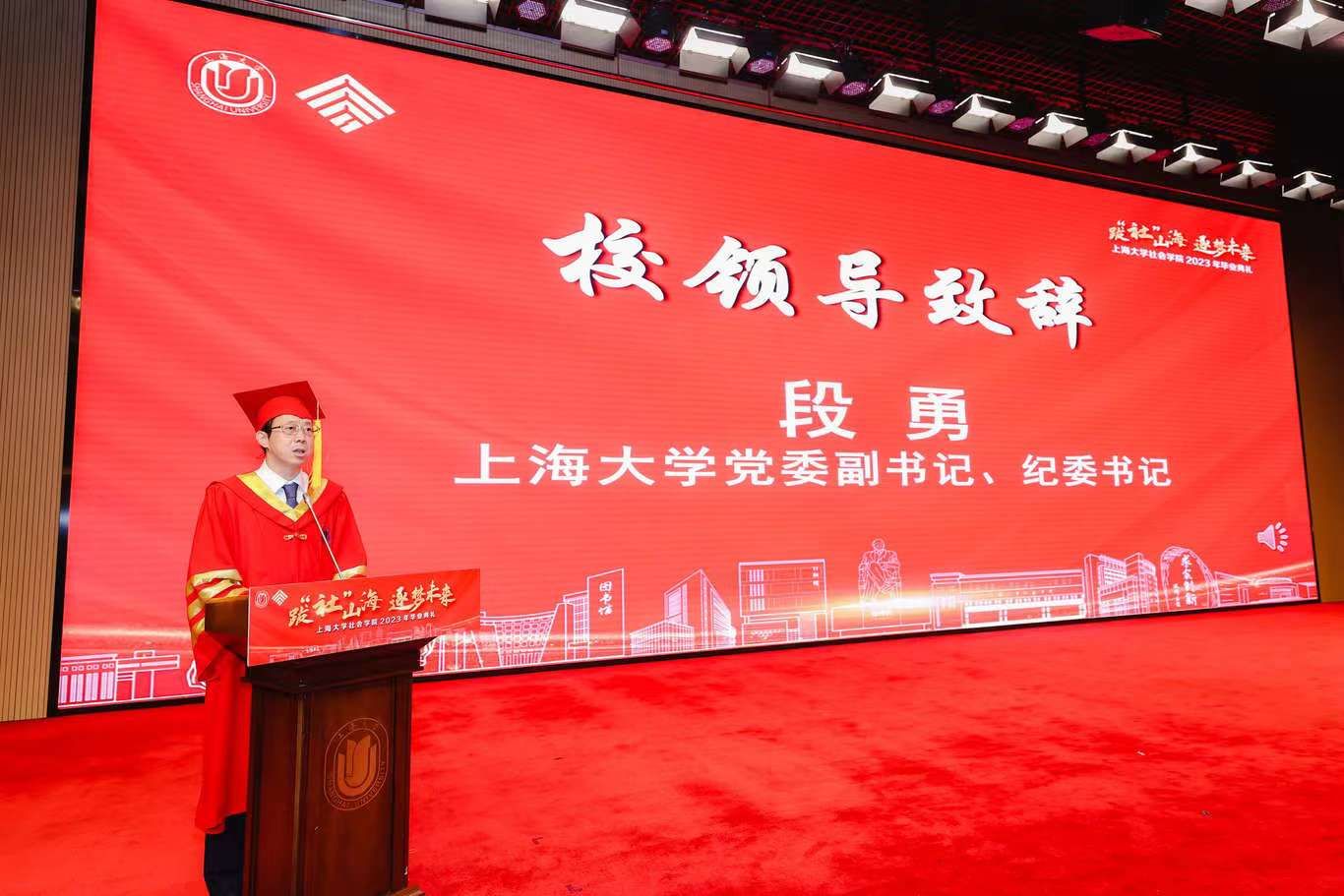 典礼伊始,校党委副书记、纪委书记段勇上台致辞。他表示,23届的毕业生是特殊的一届毕业生,经历了跌宕起伏的校园生活,又即将面对风险重重的未来。鉴于此,段书记为23届毕业生献上了八字箴言,即“健康、平安、幸福、成功”。段书记将于右任校长的“江山有待”与钱伟长校长的“自强不息”赠予毕业生们,祝福他们的同时也希望他们在走出社院后依然谨记两位校长的教导,继往开来、得见前路坦荡。