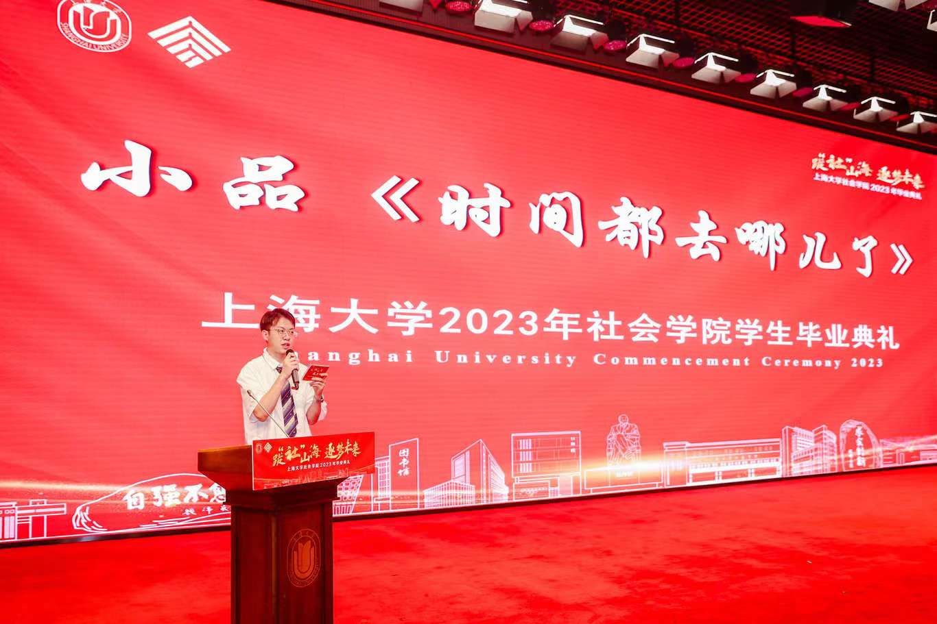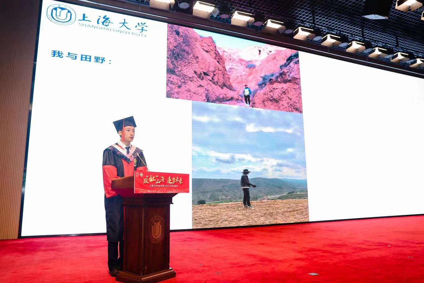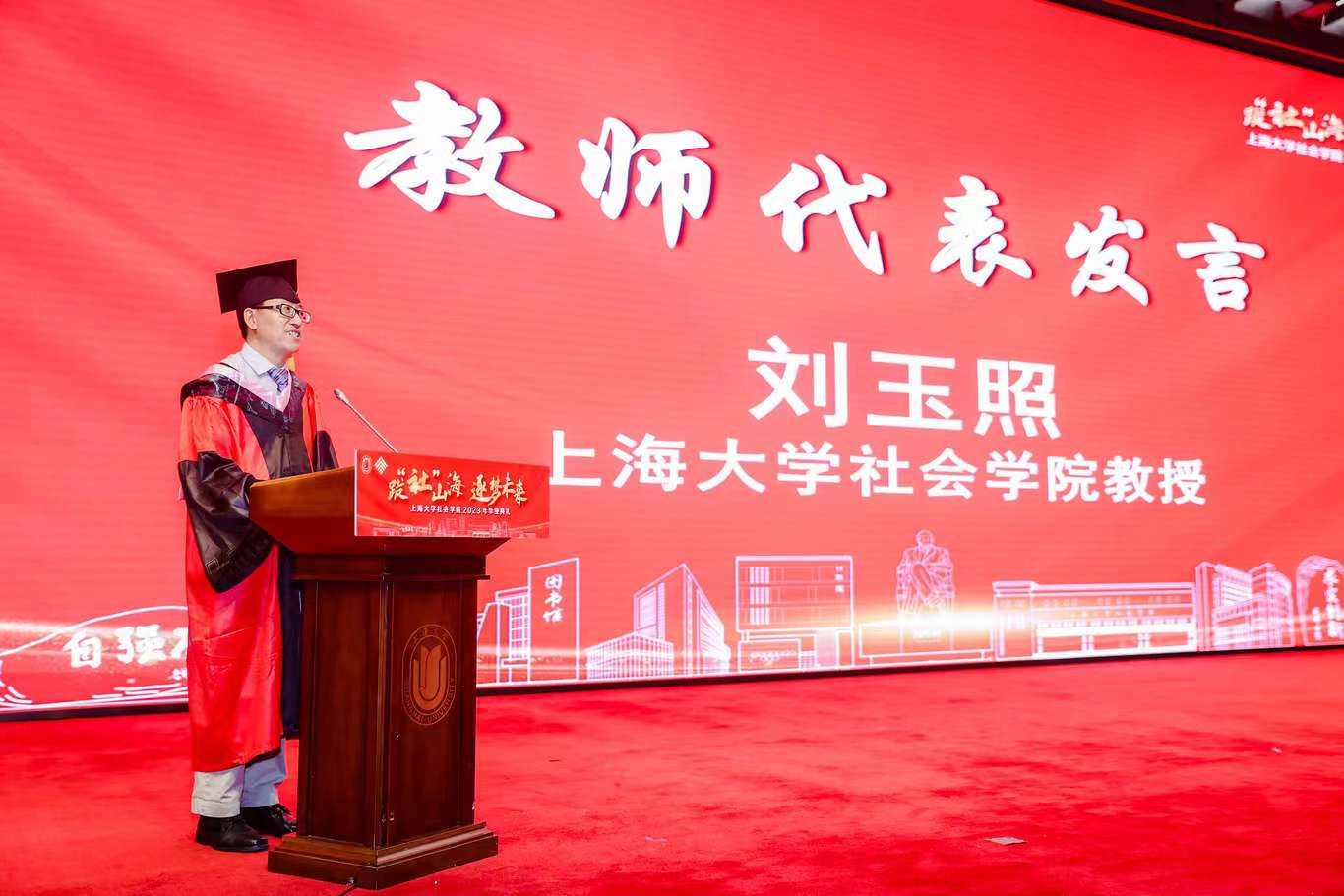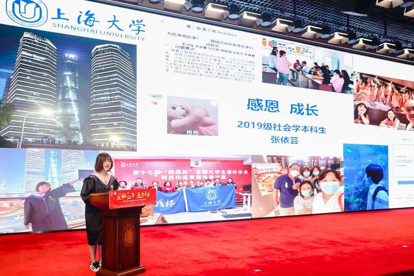 典礼伊始,校党委副书记、纪委书记段勇上台致辞。他表示,23届的毕业生是特殊的一届毕业生,经历了跌宕起伏的校园生活,又即将面对风险重重的未来。鉴于此,段书记为23届毕业生献上了八字箴言,即“健康、平安、幸福、成功”。段书记将于右任校长的“江山有待”与钱伟长校长的“自强不息”赠予毕业生们,祝福他们的同时也希望他们在走出社院后依然谨记两位校长的教导,继往开来、得见前路坦荡。