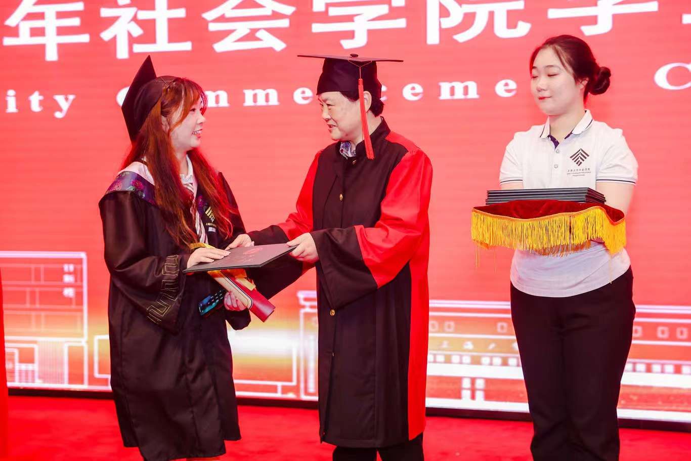毕业典礼在激昂的《中华人民共和国国歌》中拉开了帷幕。倾注了心血与真情的毕业主视频《跋“社”山海 逐梦未来》将同学们在社院学习的回忆铺陈开来,并传达了来自毕业生、老师们的真切祝福。毕业生代表李文涛和新生代表徐海瑶也随后进行了院旗交接仪式。