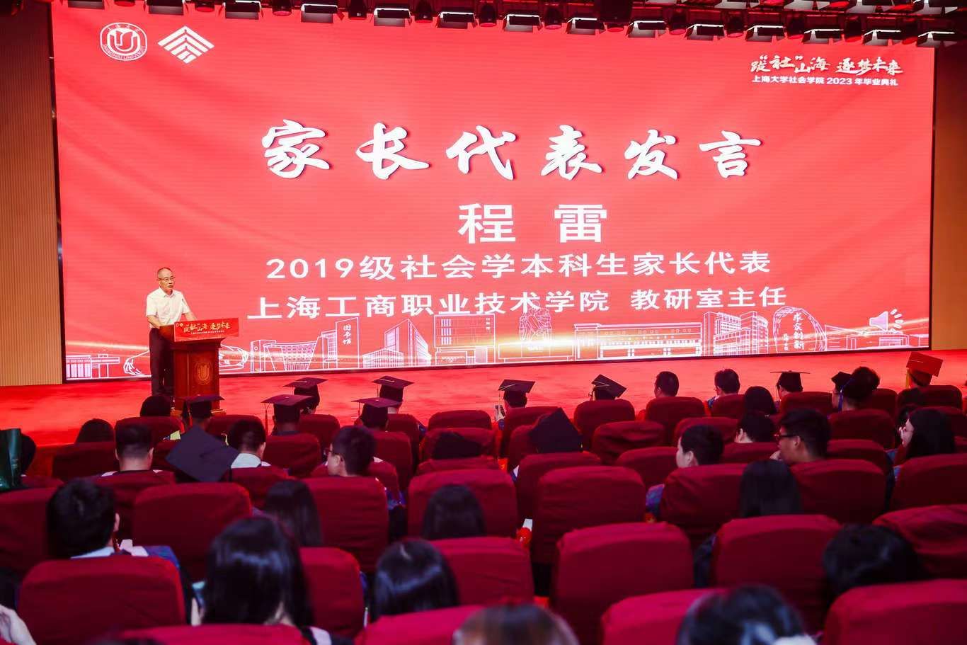 2019级社会学本科生家长代表、上海工商职业技术学院教研室主任程雷先生作为家长代表上台发言。身在一个拥有三代“上大”基因的家庭,他对ok138cn太阳集团怀着一份深厚的情谊。程雷先生对校院领导、老师和辅导员们耐心细致的陪伴表达了深深的感激。同时,他也祝福毕业生能够成为善良、幸福的人,在未来的日子里谨记校训院训,自强不息、扎根田野、展望未来。