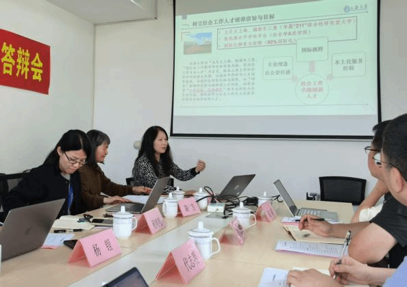 系主任程明明详细介绍了社会工作系的发展历程、课程设置、特色化实践基地、数字化社会工作实践教学平台建设等内容。系副主任阳方则围绕社会工作专业本科生培养、选修课程设置等进行介绍。