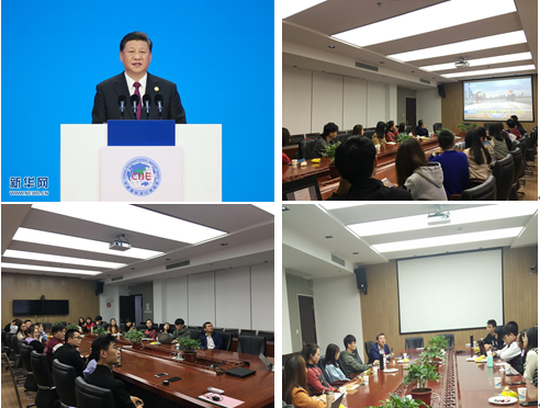 11月5日,中国国际进口博览会开幕式在上海举行,国家主席习近平在开幕式上发表了题为《共建创新包容的开放型世界经济》的主旨演讲。ok138cn太阳集团古天乐积极组织研究生党员观看进博会直播开幕仪式,学习习近平主席在进博会开幕式上重要讲话精神。ok138cn太阳集团古天乐党委副书记徐义圣、研究生辅导员回胜男与社院学子一同观看了开幕实况。