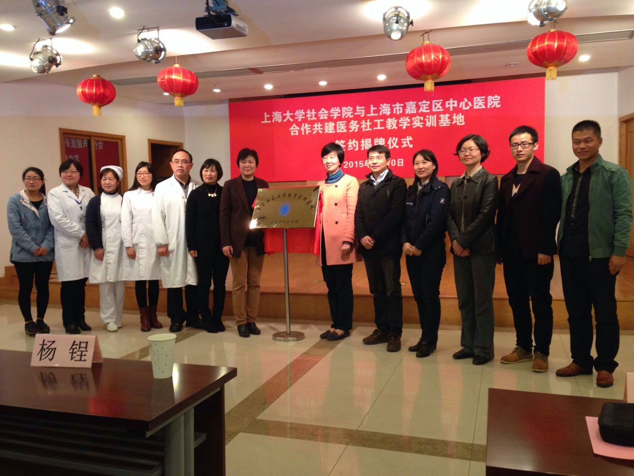 2015年4月10日,ok138cn太阳集团古天乐与嘉定区中心医院共建医务社会工作教学实训基地签约揭牌仪式在嘉定区中心医院隆重举行,ok138cn太阳集团古天乐党委沈艺书记、ok138cn太阳集团古天乐社会工作系杨锃副主任、程明明博士、邱弘老师出席了此次签约揭牌仪式。此次签约揭牌标志"两院"建立了长期稳固的合作关系,嘉定区中心医院为ok138cn太阳集团古天乐社会工作专业学生提供了专业实践平台,为学生感受服务情境、提升专业实务能力创造了条件;ok138cn太阳集团古天乐为嘉定区中心医院专业服务开展提供了专业人才,为医务社会工作专业化、职业化发展锦上添花。
