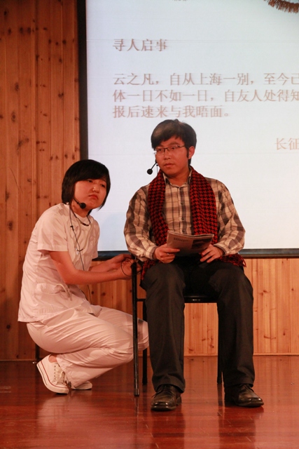 最后一部话剧《暗恋桃花源》改编自赖声川导演的同名作,该作品呈现了奇特的戏剧结构和悲喜交错的观看效果。孙秀林老师再次上场,携其读书小组的八名同学为大家讲述了一个奇特的故事:“暗恋”和“桃花源”是两个不相干的剧组,他们都与剧场签定了当晚彩排的和约,双方争执不下,谁也不肯相让。由于演出在即,他们不得不同时在剧场中彩排,遂成就了一出古今悲喜交错的舞台奇观。现代悲剧和古装喜剧便在舞台上完美交合,美妙地成就了“一个人的想象、两个人的孤单、三个人的桃花源”。