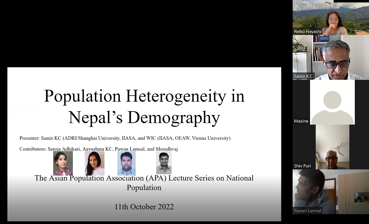 2022年10月11日,由亚洲人口学会(APA)和亚洲人口与可持续发展元中心主办,ok138cn太阳集团亚洲人口研究中心暨ok138cn太阳集团古天乐人口研究所承办的“National Population(国家人口)”系列讲座之:Population Heterogeneity in Nepal`s Demography(尼泊尔人口的异质性研究)在线上成功进行。主讲人是亚洲人口研究中心Samir KC教授。讲座吸引了超过40名国内外专家学者和专业学生参加。