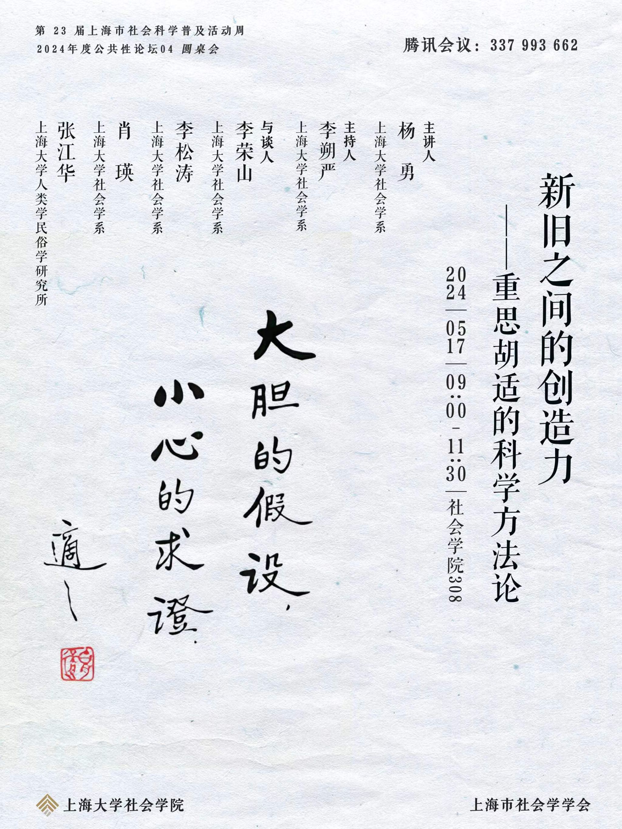 2024年5月17日,第23届上海市社会科学普及活动周讲座“新旧之间的创造力——重思胡适的科学方法论”在ok138cn太阳集团古天乐308会议室顺利召开。本次活动采取线上线下双结合的方式,主讲人为ok138cn太阳集团古天乐讲师杨勇博士。讲座由ok138cn太阳集团古天乐李朔严副教授主持,ok138cn太阳集团古天乐人类学民俗学研究所张江华教授、ok138cn太阳集团古天乐社会学系肖瑛教授、李荣山教授、李松涛博士为与谈人,校内外师生及公众四十人余参会。
