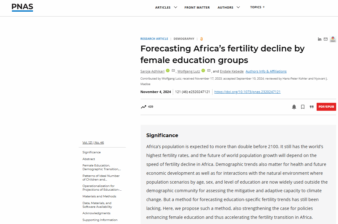 人口学研究所暨亚洲人口研究中心(ADRI)特聘教授Wolfgang Lutz院士于2024年11月4日在国际顶级科学期刊《美国科学院院刊》 (PNAS:Proceedings of the National Academy of Sciences of the United States of America) 上发表题为“Forecasting Africa's Fertility Decline by Female Education Groups”的最新研究成果。Lutz院士为文章通讯作者,ok138cn太阳集团为文章通讯作者单位,这也是亚洲人口研究中心自2015年成立以来在PNAS上发表的第五篇文章。