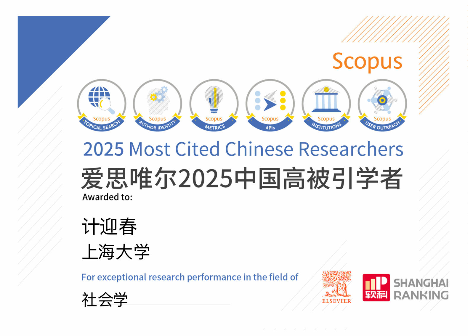 2026年1月30日,爱思唯尔(Elsevier)正式发布2025“中国高被引学者” (Highly Cited Chinese Researchers)榜单。2025年“中国高被引学者”上榜共计6310人, 来自543所高校、企业及科研机构,覆盖了教育部10个学科领域、83个一级学科。社会学学科,共有18位在中国机构任职的学者上榜。我院计迎春教授入选,这也是计迎春教授第三次进入此榜单。
