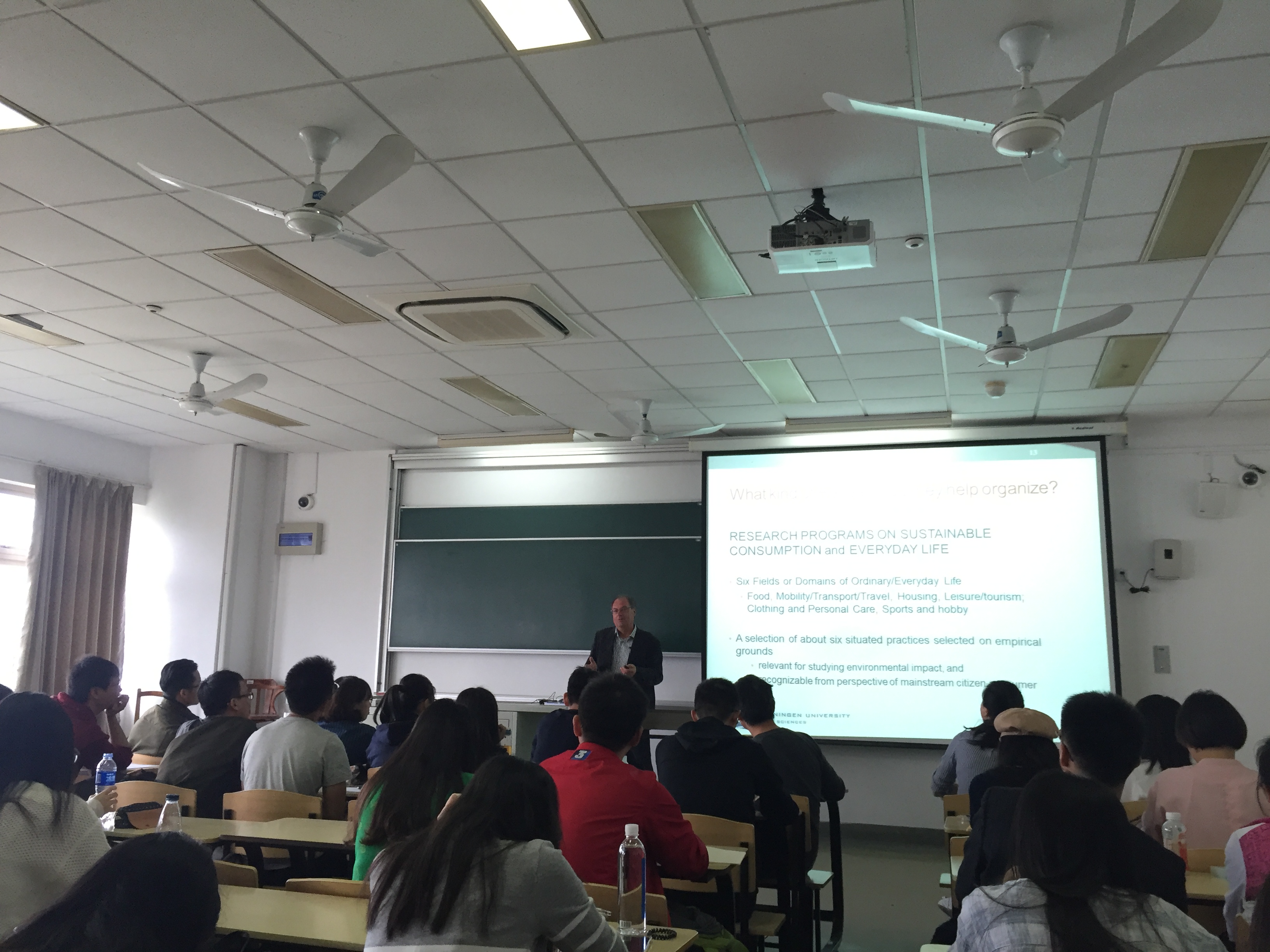 Gert Spaargaren教授阐述了在社会变迁的背景下,实践理论在结构主义和个人主义两种范式之间寻找平衡的必要性与可能性。尤其是针对可持续消费问题,他详细介绍了在实践理论的研究框架下,他的团队如何将微观层面消费者个人的生活方式与宏观层面的社会供给相结合。讲座的提问环节十分热烈,同学们与Gert Spaargaren教授探讨了实践理论研究中考虑权力、社会分层等重要变量的可能性等问题。