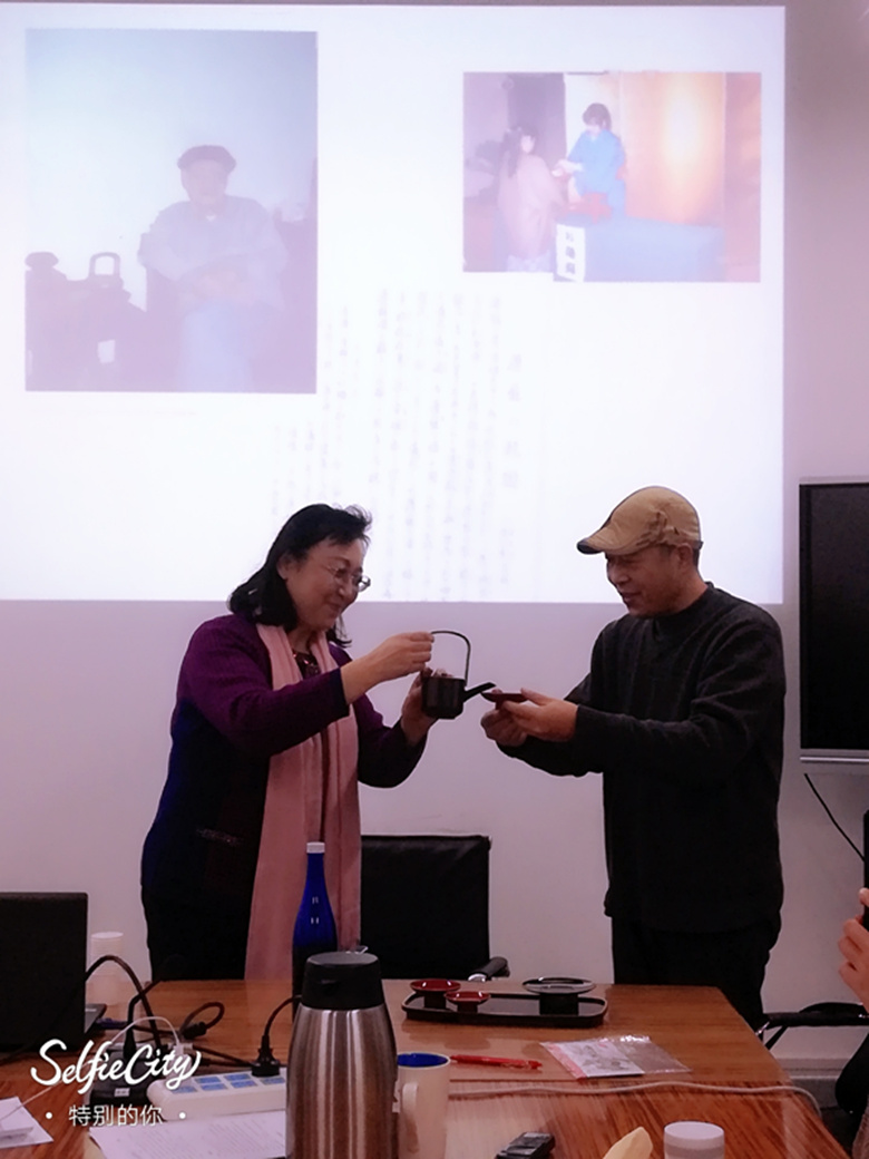 第三个讲座是在2018.1.2晚上社会学楼516会议室,主题是关于日本的屠苏酒文化。在这一次的讲座中,何彬教授专门准备了日本的屠苏酒和一些节日吃食,并且为了全方位还原日本喝屠苏酒的场景,专门把配套的酒具也带来了民俗学的课堂中。大家通过亲自品尝屠苏酒,亲自进行喝酒前的仪式准备,对日本的酒文化有了更进一步的了解。在这里,何彬教授还亲自给耿敬教授敬了三碗酒,对其表示深深的感谢与尊敬。这一场讲座,为中日两国文化的深入交流做出了巨大的贡献,也让课堂的学子们对日本民俗文化有了更加亲身的体验。