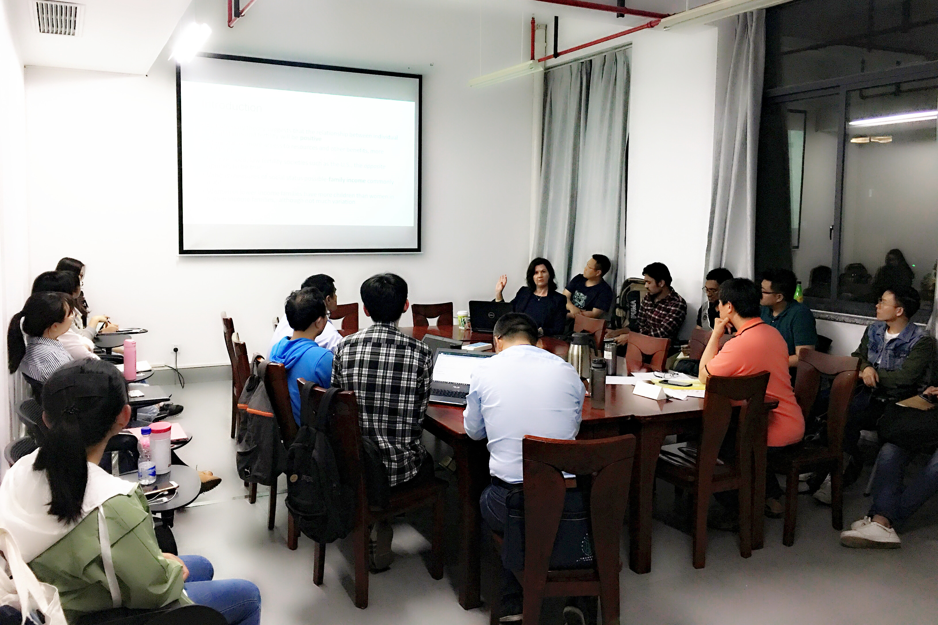 此次讲座的主题是美国社会中个人资源、家庭资源和多个伙伴对生育影响存在的性别差异(Sex differences in the effects of Personal Resources,Family Resources,and  on Fertility in the U.S.)。研究使用了2014年美国人口普查数据,经分析发现,资源的来源对男性和女性的生育能力的影响具有显著差异,同时,收入和财富对于生育能力的影响也是不同的。讲座进行期间,Rosemary L. Hopcroft博士与我院硕士、博士研究生以及国际留学生进行了积极交流,耐心解答同学们提出的问题。尽管由于时间限制,很多关于该项研究的细节并未详细展开,但是Rosemary 博士独到的研究视角仍然给同学们以深刻的启迪。