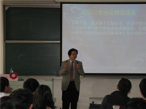 朱国华教授的讲座包括九个部分:1、美国和中国金融危机:本质与差异;2、行业协会定义、功能及法规背景;3、行业协会在知识产权领域发挥作用分析;4、美国知识产权联盟的案例分析;5、中国著作权集体管理案例分析;6、上海生物医药行业协会案例与行业知识产权战略案例透析;7、国家知识产权战略之缺失;8、行业协会知识产权战略之强化;9、行业协会知识产权战略。朱教授从中国加入WTO,经济一体化,思维范式变迁,金融危机并未见底,前景不明朗等背景出发,思考美国次贷危机,何以导致全球金融危机?其本质是什么?解救良方是什么?是头痛医头、脚痛医脚还是辩证施治?他判断经济危机不仅仅依靠经济方式解决,还有社会化的解决方案。认为法律社会学有助于从本质上驾驭这一社会现象。接着,他从行业协会入手,追溯了威尼斯、日本、意大利、美国等国家行业协会的历史、功能与法制建设,同时分析了中国行业协会的法律依据及现实境遇,探讨行业协会在中国应有的地位和制度空间。对此,他具体剖析了美国知识产权联盟、中国著作权集体管理、上海生物医药行业协会等案例。认为行业协会具有自己的优势,既有行政权威的优势,也有社会组织的优势,扮演着天然桥梁与管道作用,发挥良好的协调与纠偏功能,促进知识产权自主创新,强化国家知识产权战略。最后,与会同学提问,朱教授以强烈的学术情怀和责任心,理论联系实际地给予回答。