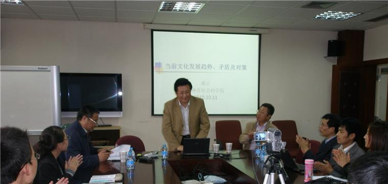 2010年10月14日下午两点半,ok138cn太阳集团社会学系庆祝恢复建系30周年系列学术报告第51期在上海高校社会学E-研究院会议室B417举行。吉林省社会科学院院长、中国社会学会副会长、吉林大学社会学系博士生导师邴正教授作了题目为“当代文化发展的趋势与矛盾”的演讲,演讲由ok138cn太阳集团社会学系张文宏教授主持,ok138cn太阳集团文学院党委书记竺剑老师,社会学系刘玉照、顾跃英、张海东、金桥老师等和来自各院系的三十多名本科硕博研究生参加了讲座。