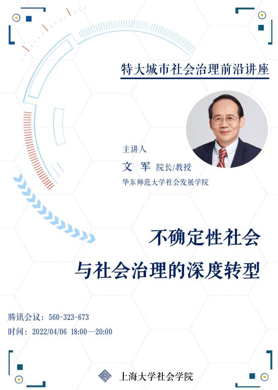 在这次的讲座中,文军教授将在人类社会所步入的不确定发展阶段背景下,从不确定所带来的中国社会治理困境出发,探讨在树立不确定性思维的基础上,如何从主体赋能、机制创新、制度创设等维度入手,推动社会治理的深度转型。以此走出新发展阶段中国社会治理的困境,提升治理效能。