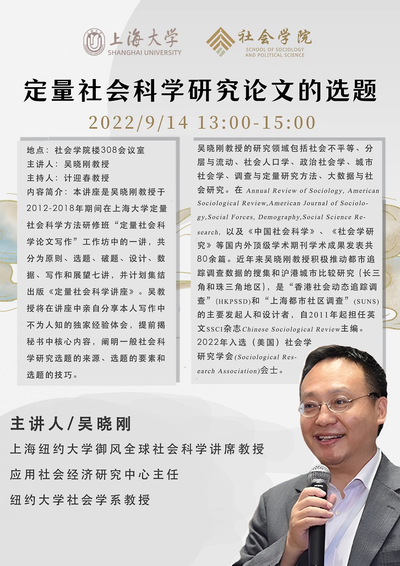 本讲座是吴晓刚老师2012-2018年在ok138cn太阳集团定量社会科学方法研修班“定量社会科学论文写作”工作坊的其中一讲(原为共五讲)。有热心学员录音整理,分成原则、选题、破题、设计、数据、写作和展望共七讲,计划集结出版《定量社会科学讲座》。本次讲座结合吴晓刚老师写作的经验体会,提前揭秘书中核心内容,阐明一般社会科学研究选题的来源、选题的要素和选题的技巧。