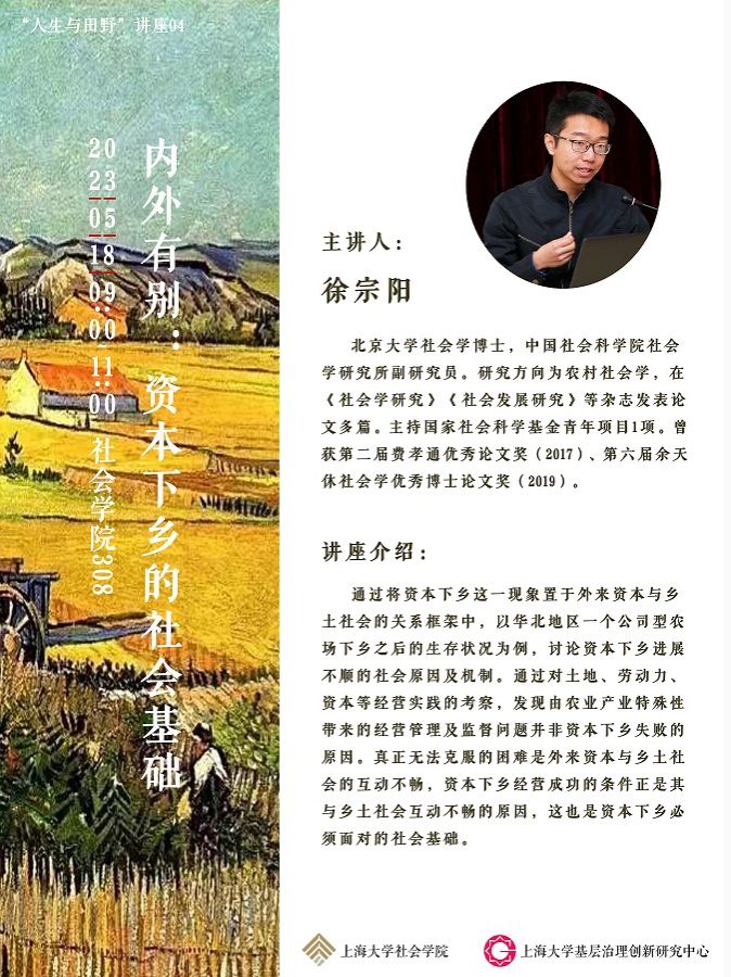 主讲人徐宗阳,北京大学社会学博士,中国社会科学院社会学研究所副研究员。研究方向为农村社会学,在《社会学研究》《社会发展研究》等杂志发表论文多篇。主持国家社会科学基金青年项目1项。曾获第二届费孝通优秀论文奖(2017)、第六届余天休社会学优秀博士论文奖(2019)。