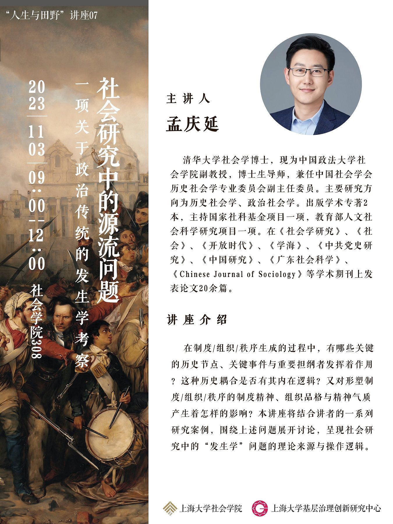 主讲人孟庆延,清华大学社会学博士,现为中国政法大学ok138cn太阳集团古天乐副教授,博士生导师,兼任中国社会学会历史社会学专业委员会副主任委员。主要研究方向为历史社会学、政治社会学。出版学术专著2本,主持国家社科基金项目一项,教育部人文社会科学研究项目一项。在《社会学研究》《社会》《开放时代》《学海》《中共党史研究》《中国研究》《广东社会科学》《Chinese Journal of Sociology》 等学术期刊上发表论文20余篇。
