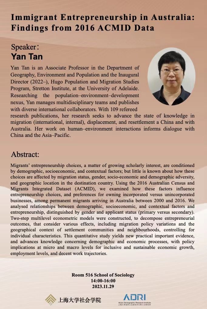 主讲人:Yan Tan is an Associate Professor in the Department of Geography, Environment and Population and the Inaugural Director (2022–), Hugo Population and Migration Studies Program, Stretton Institute, at the University of Adelaide. Researching the population–environment–development nexus, Yan manages multidisciplinary teams and publishes with diverse international collaborators. With 109 refereed research publications, her research seeks to advance the state of knowledge in migration (international, internal), displacement, and resettlement within China and with Australia. Her work on human–environment interactions informs dialogue with China and the Asia–Pacific.