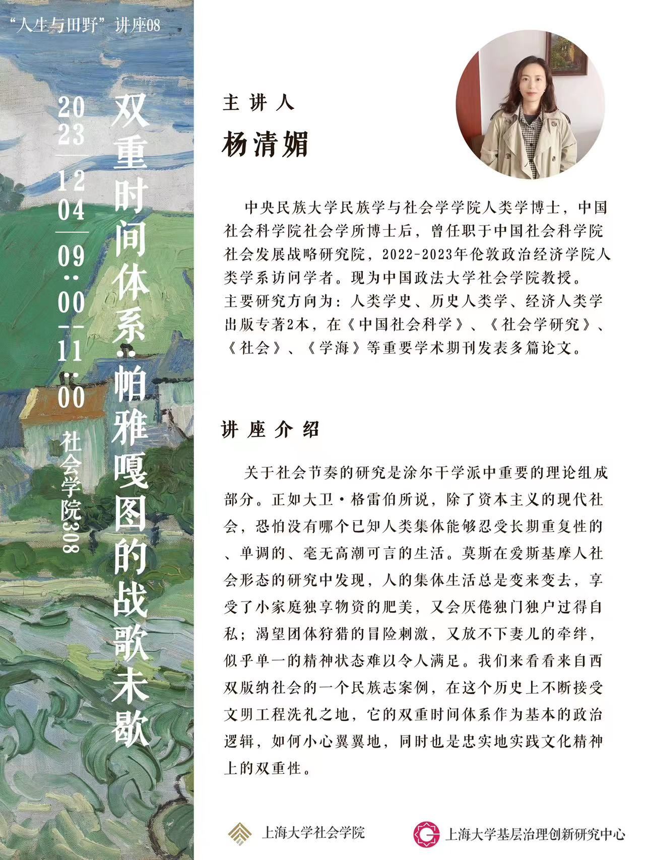 主讲人杨清媚,中央民族大学民族学与社会学学院人类学博士,中国社会科学院社会学所博士后,曾任职于中国社会科学院社会发展战略研究院,2022-2023年伦敦政治经济学院人类学系访问学者。现为中国政法大学ok138cn太阳集团古天乐教授。主要研究方向为:人类学史、历史人类学、经济人类学出版专著2本,在《中国社会科学》《社会学研究》《社会》《学海》等重要学术期刊发表多篇论文。
