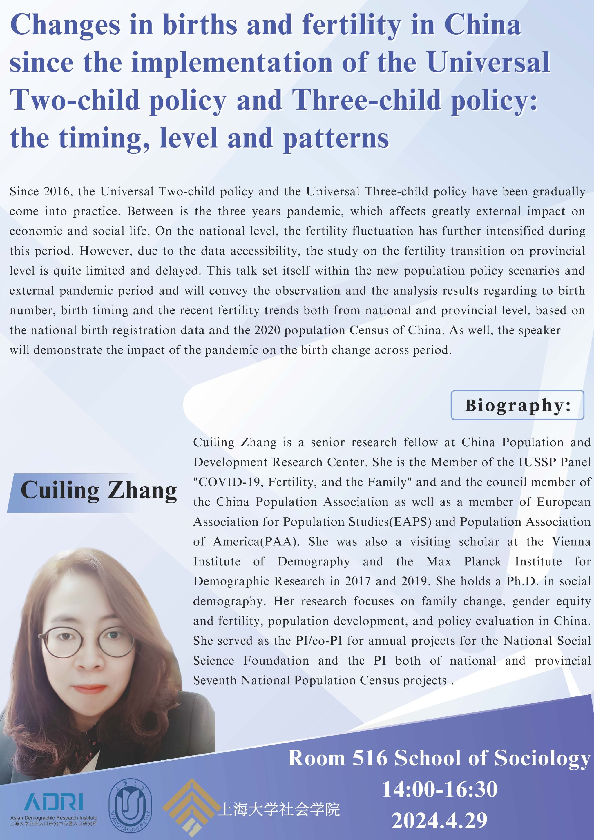 主讲人:Cuiling Zhang is a senior research fellow at China Population and Development Research Center. She is the Member of the IUSSP Panel "COVID-19, Fertility, and the Family" and and the council member of the China Population Association as well as a member of European Association for Population Studies(EAPS) and Population Association of America(PAA). She was also a visiting scholar at the Vienna Institute of Demography and the Max Planck Institute for Demographic Research in 2017 and 2019. She holds a Ph.D. in social demography. Her research focuses on family change, gender equity and fertility, population development, and policy evaluation in China. She served as the PI/co-PI for annual projects for the National Social Science Foundation and the PI both of national and provincial Seventh National Population Census projects.