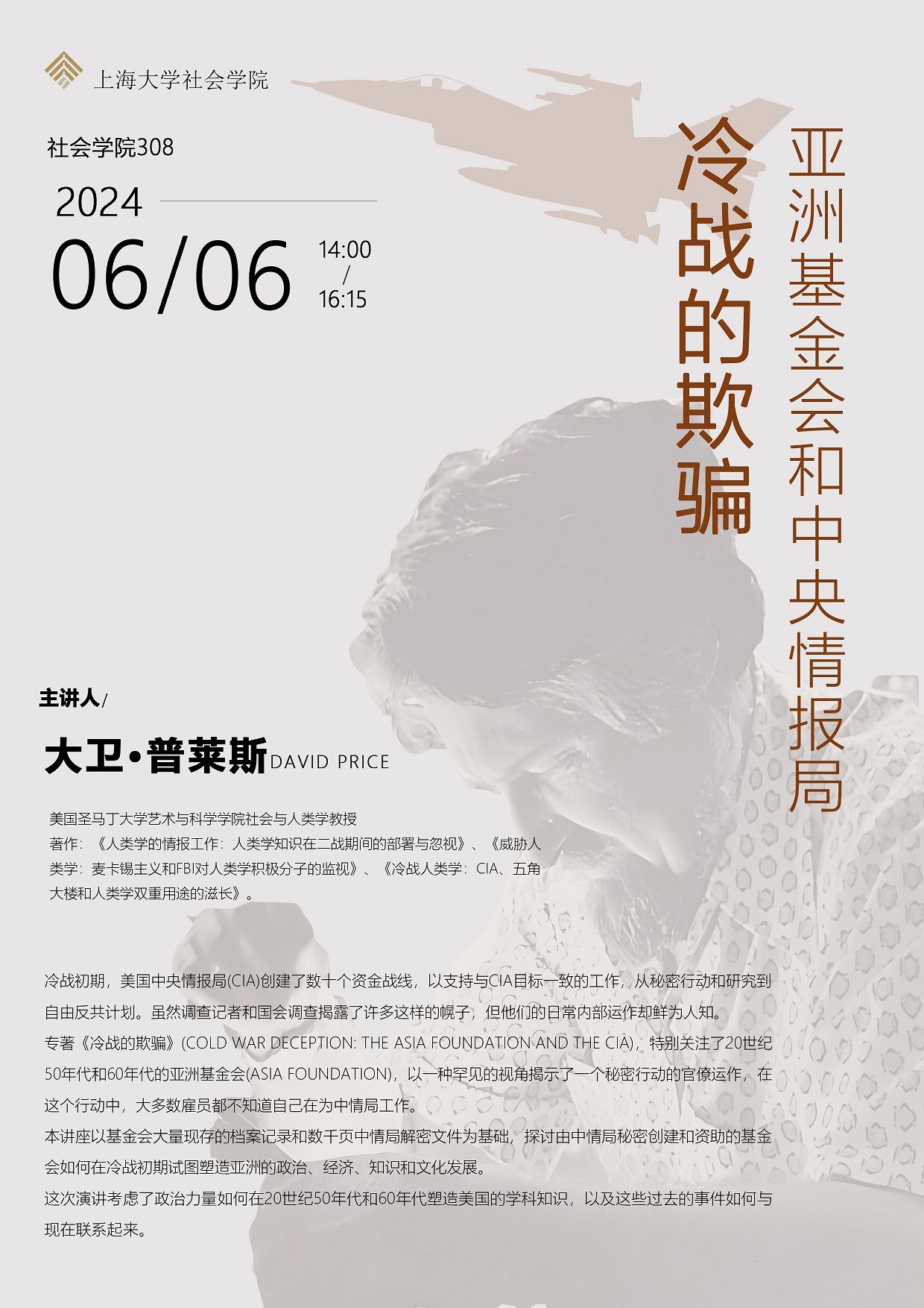主讲人:大卫·普莱斯(David Price),美国圣马丁大学艺术与科学学院社会与人类学教授,在人类学史的研究方面有突出贡献。1985-1990年担任马文·哈里斯的调查助理,1993年获得弗罗里达大学人类学系博士学位。1990年早期开始从事美国人类学家与军事、情报机构之间的历史与当下互动。借助《信息自由法》解禁的大量文件、访谈和档案调查、公开发表的调查和著作等,他得以展现了人类学家是如何与CIA、FBI和国家安全局、五角大厦等美国情报机构互动的。围绕这些档案田野,他先后出版了三部著作:《人类学的情报工作:人类学知识在二战期间的部署与忽视》、《威胁人类学:麦卡锡主义和FBI对人类学积极分子的监视》、《冷战人类学:CIA、五角大楼和人类学双重用途的滋长》。