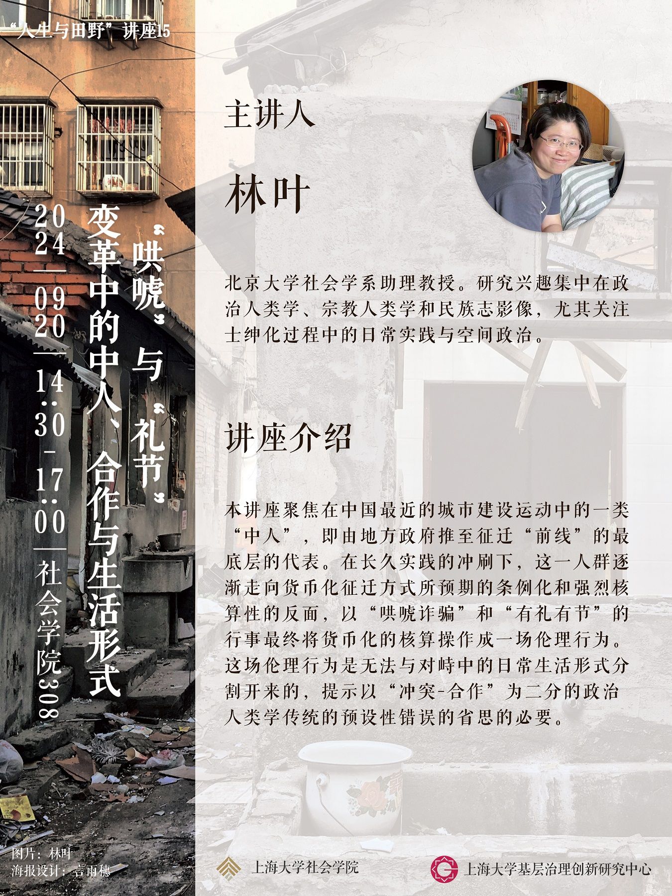 主讲人:林叶,北京大学社会学系助理教授。研究兴趣集中在政治人类学、宗教人类学和民族志影像,尤其关注士绅化过程中的日常实践与空间政治,著有博士论文《钉子和拆子:旧城征迁中的空间、家庭与社会联结》,发表相关议题的民族志和理论文章若干,如《“废墟”上的栖居——拆迁遗留地带的测度与空间生产》《拆“穿”的家庭:居住史、再分家与边界战争》等。