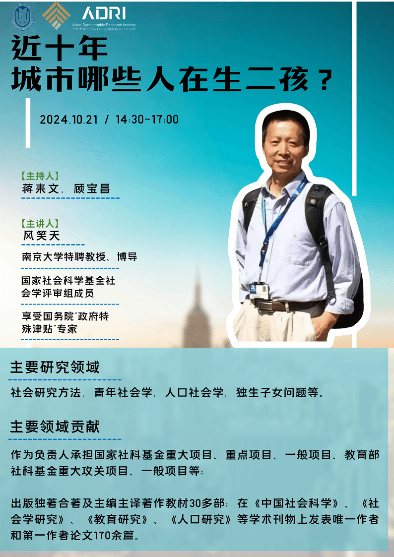 主讲人:风笑天,北京大学社会学博士。南京大学特聘教授,博士生导师;国家社会科学基金社会学评审组成员;享受国务院“政府特殊津贴”专家。曾任教育部社会学学科教学指导委员会第一届、第二届委员;湖北省社会学会常务副会长,湖北省人口学会副会长,湖北省人口专家咨询委员会委员等。1996年以来,先后受聘为中国人民公安大学荣誉教授;广西师范大学讲席教授;华侨大学、南京林业大学特聘教授;浙江师范大学、中国青年政治学院客座教授;华中师范大学、华中农业大学、中南大学、南昌大学等高校兼职教授。主要研究领域为社会研究方法,青年社会学,人口社会学,独生子女问题等。作为负责人承担国家社科基金重大项目、重点项目、一般项目、教育部社科基金重大攻关项目、一般项目等;出版独著、合著、及主编、主译著作、教材30多部;在《中国社会科学》、《社会学研究》、《教育研究》、《人口研究》等学术刊物上发表唯一作者和第一作者论文170余篇。
