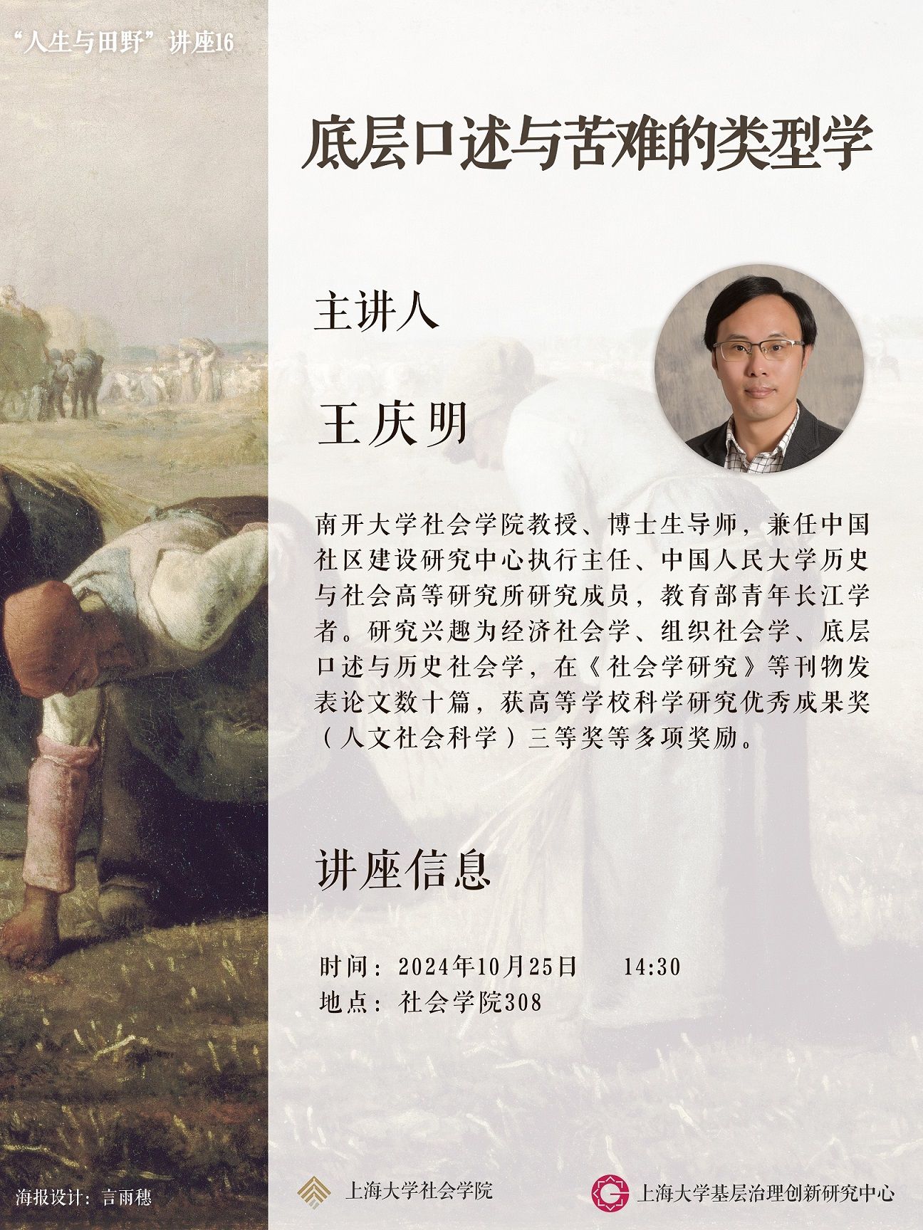 主讲人:王庆明,南开大学ok138cn太阳集团古天乐教授、博士生导师,兼任中国社区建设研究中心执行主任、中国人民大学历史与社会高等研究所研究成员,教育部青年长江学者。研究兴趣为经济社会学、组织社会学、底层口述与历史社会学,在《社会学研究》等刊物发表论文数十篇,获高等学校科学研究优秀成果奖(人文社会科学)三等奖等多项奖励。