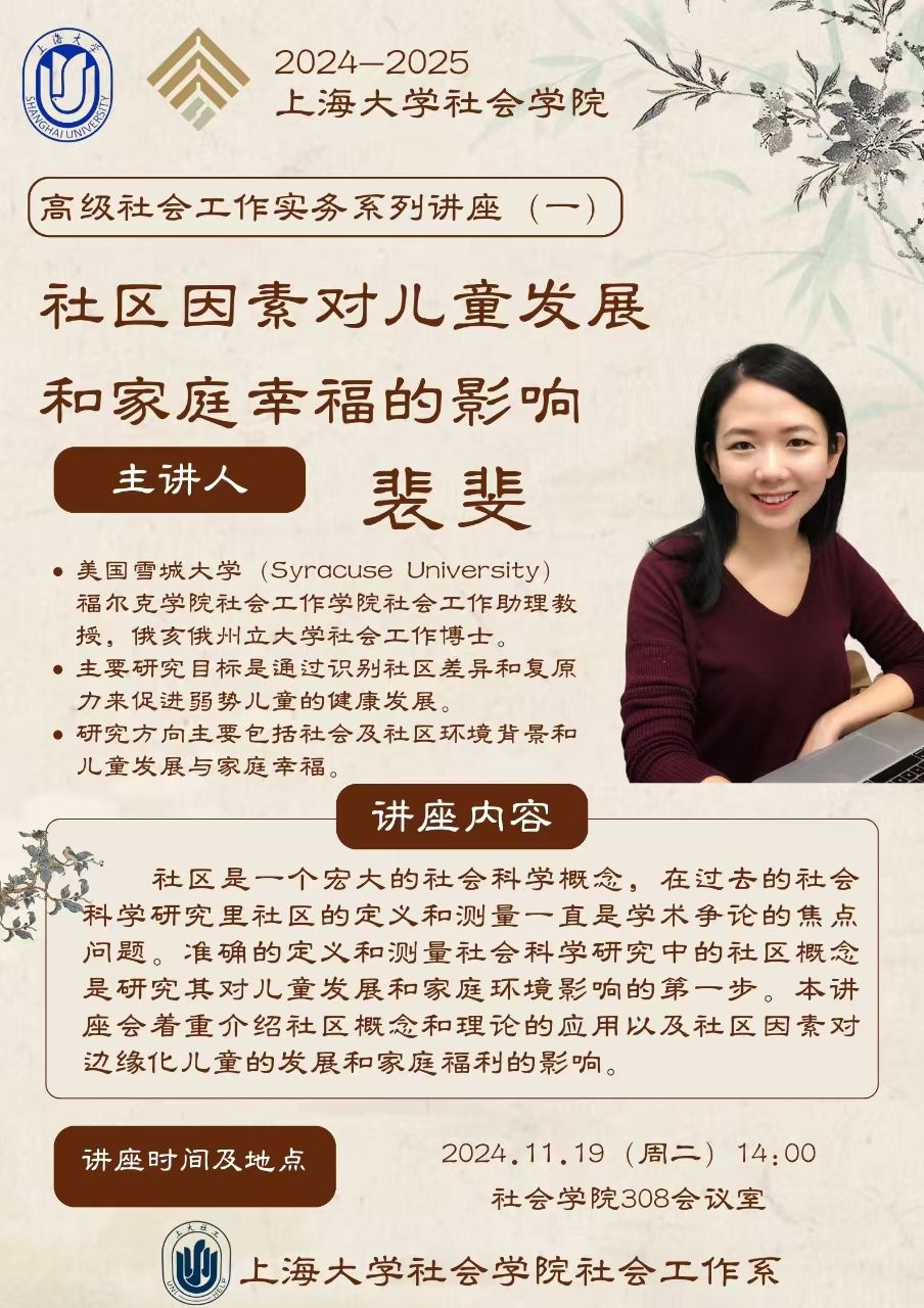 主讲人:裴斐,美国雪城大学 (Syracuse University)福尔克学院社会工作学院社会工作助理教授,俄亥俄州立大学社会工作博士。主要研究目标是通过识别社区差异和复原力来促进弱势儿童的健康发展。研究方向主要包括社会及社区环境背景和儿童发展与家庭幸福。