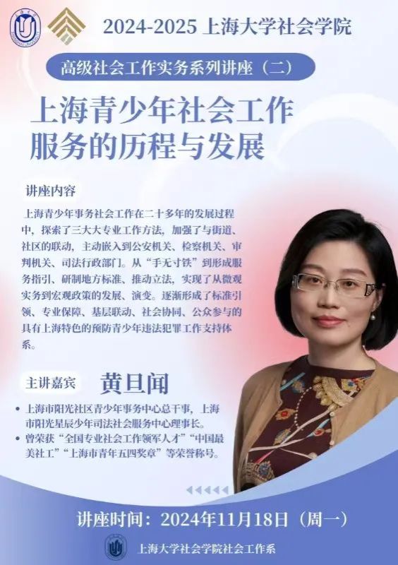 主讲人:黄旦闻,高级社工师,上海市阳光社区青少年事务中心总干事,上海市阳光星辰少年司法社会服务中心理事长。从事青少年社会工作服务已近21年。曾荣获“全国专业社会工作领军人才”“中国最美社工”“上海市青年五四奖章”等荣誉称号。目前还担任中国社会工作学会司法社会工作专业委员会理事、上海市社会工作者协会青少年事务专业委员会副主任等社会职务。