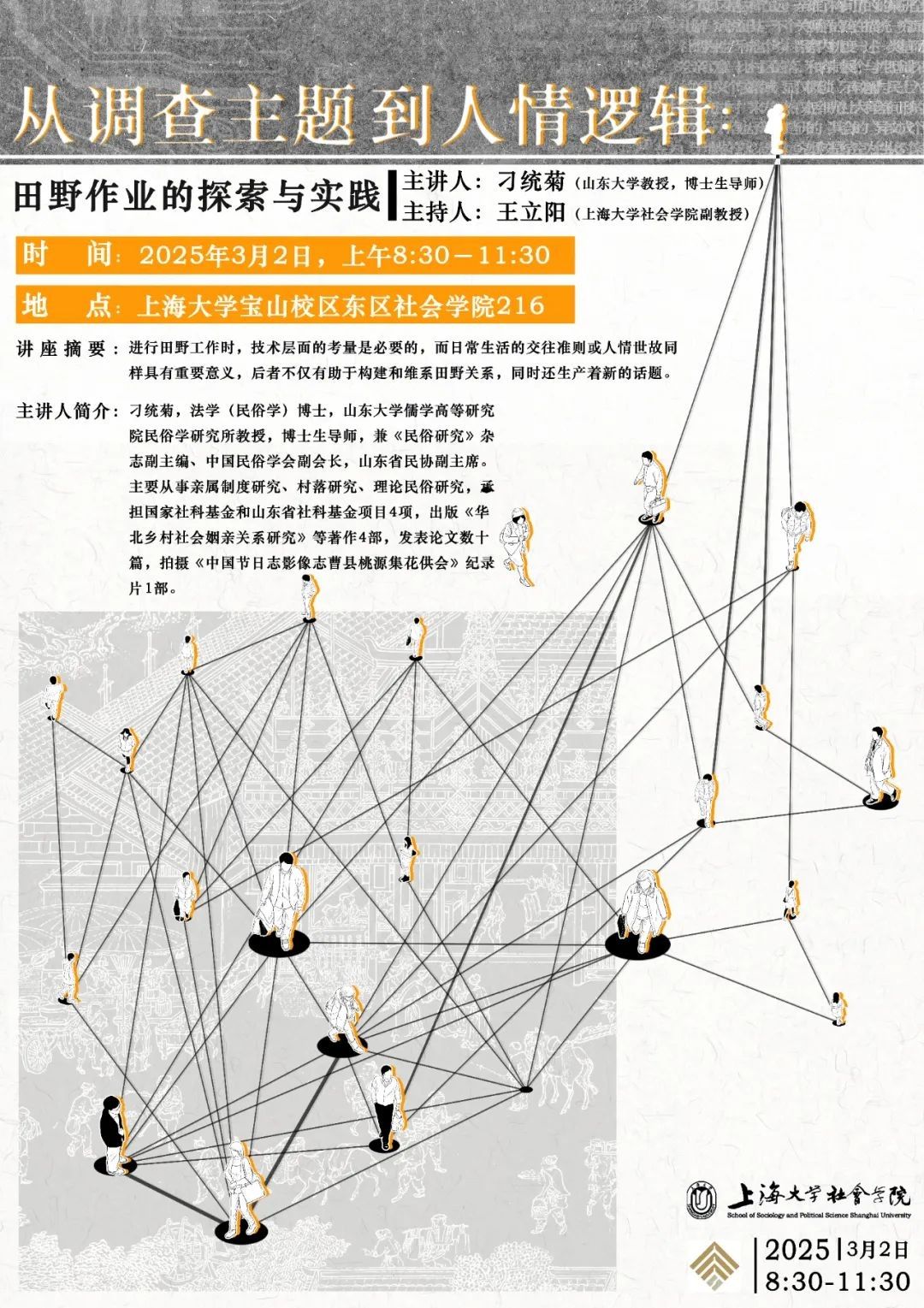主讲人:刁统菊,法学(民俗学)博士,山东大学儒学高等研究院民俗学研究所教授,博士生导师,兼《民俗研究》杂志副主编、中国民俗学会副会长,山东省民协副主席。主要从事亲属制度研究、村落研究、理论民俗研究,承担国家社科基金和山东省社科基金项目4项,出版《华北乡村社会姻亲关系研究》等著作4部,发表论文数十篇,拍摄《中国节日志影像志曹县桃源集花供会》纪录片1部。