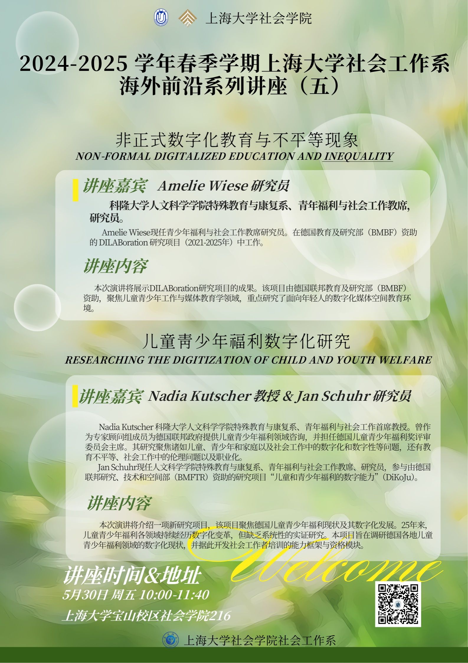 主讲人:Nadia Kutscher(娜迪娅·库彻),科隆大学人文科学学院特殊教育与康复系、青年福利与社会工作首席教授。曾作为专家顾问组成员为德国联邦政府提供儿童青少年福利领域咨询,并担任德国儿童青少年福利奖评审委员会主席。其研究聚焦诸如儿童、青少年和家庭以及社会工作中的数字化和数字性等问题,还有教育不平等、社会工作中的伦理问题以及职业化。Jan Schuhr(扬·舒尔),科隆大学人文科学学院特殊教育与康复系,青年福利与社会工作教席研究员。参与由德国联邦研究、技术和空间部(BMFTR)资助的研究项目“儿童和青少年福利的数字能力”(DiKoJu)。