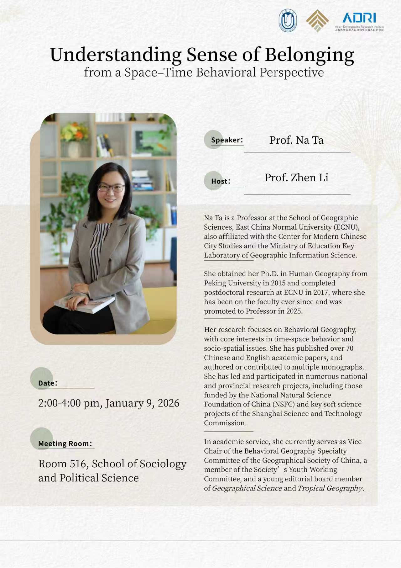Na Ta is a Professor at the School of Geographic Sciences, East China Normal University(ECNU),also affiliated with the Center for Modern Chinese City Studies and the Ministry of Education Key Laboratory of Geographic Information Science.She obtained her Ph.D. in Human Geography from Peking University in 2015 and completed postdoctoral research at ECNU in 2017, where she has been on the faculty ever since and was promoted to Professor in 2025.Her research focuses on Behavioral Geography, with core interests in time-space behavior and socio-spatial issues. She has published over 70 Chinese and English academic papers, and authored or contributed to multiple monographs. She has led and participated in numerous national and provincial research proiects,including those funded by the National Natural Science Foundation of China (NSFC) and key soft science projects of the Shanghai Science and Technology Commission. In academic service, she currently serves as Vice Chair of the Behavioral Geography Specialty Committee of the Geographical Society of China, a member of the Society's Youth Working Committee, and a young editorial board member of Geographical Science and Tropical Geography.