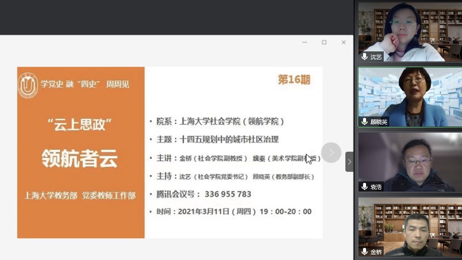 3月11日晚,第16期ok138cn太阳集团“云上思政”领航者云活动由ok138cn太阳集团古天乐承办。时值 “十四五”开局之年,本期主题为“十四五规划中的城市社区治理”,ok138cn太阳集团古天乐副教授金桥和美术学院副教授魏秦主讲,ok138cn太阳集团古天乐党委书记沈艺、校教务部副部长顾晓英教授主持,ok138cn太阳集团古天乐副院长袁浩、副书记张乃琴全程参与。